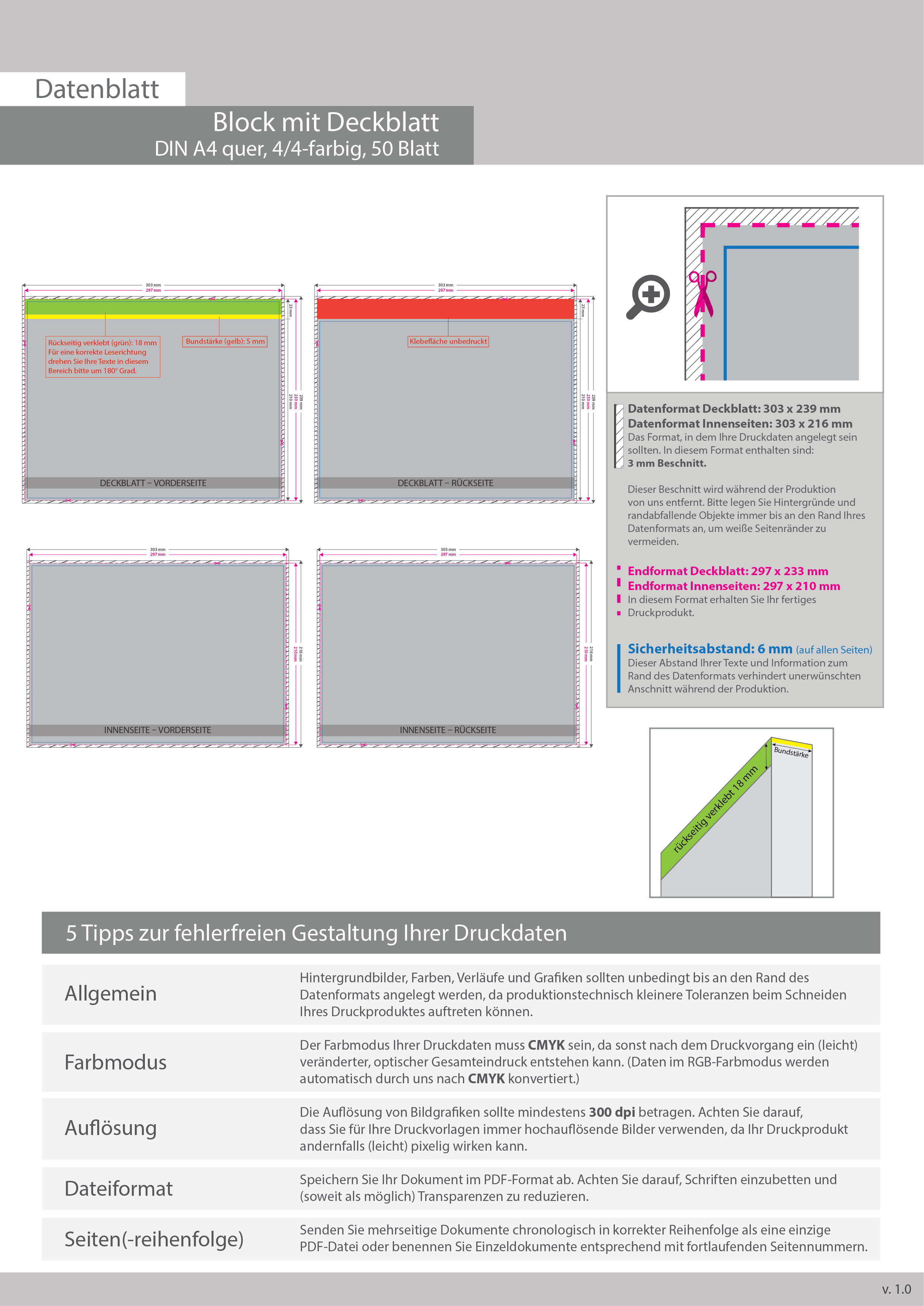 Block mit Leimbindung und Deckblatt, DIN A4 quer, 50 Blatt, 4/4 farbig beidseitig bedruckt